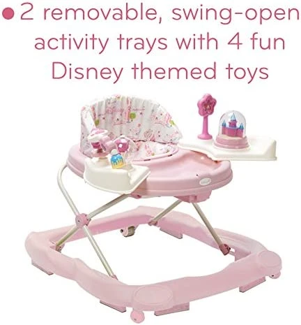 2 swing-open activity trays with 4 fun princess themed toysWalker has a 3-position height adjustment and is collapsible for easy storage Oversized snack/play traySturdy wheels work on floors or carpets, with grip strips reduce movement on uneven surfacesMachine washable padded seatRead more Maneuverable and Adjustable Walker