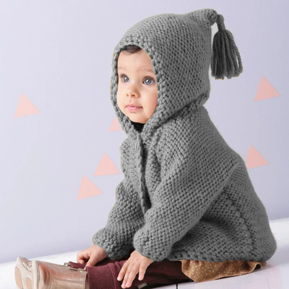 This is a cozy hooded coat for little boys and girls aged from birth to five years old. The pointed pixie hood is adorned with a tassel.