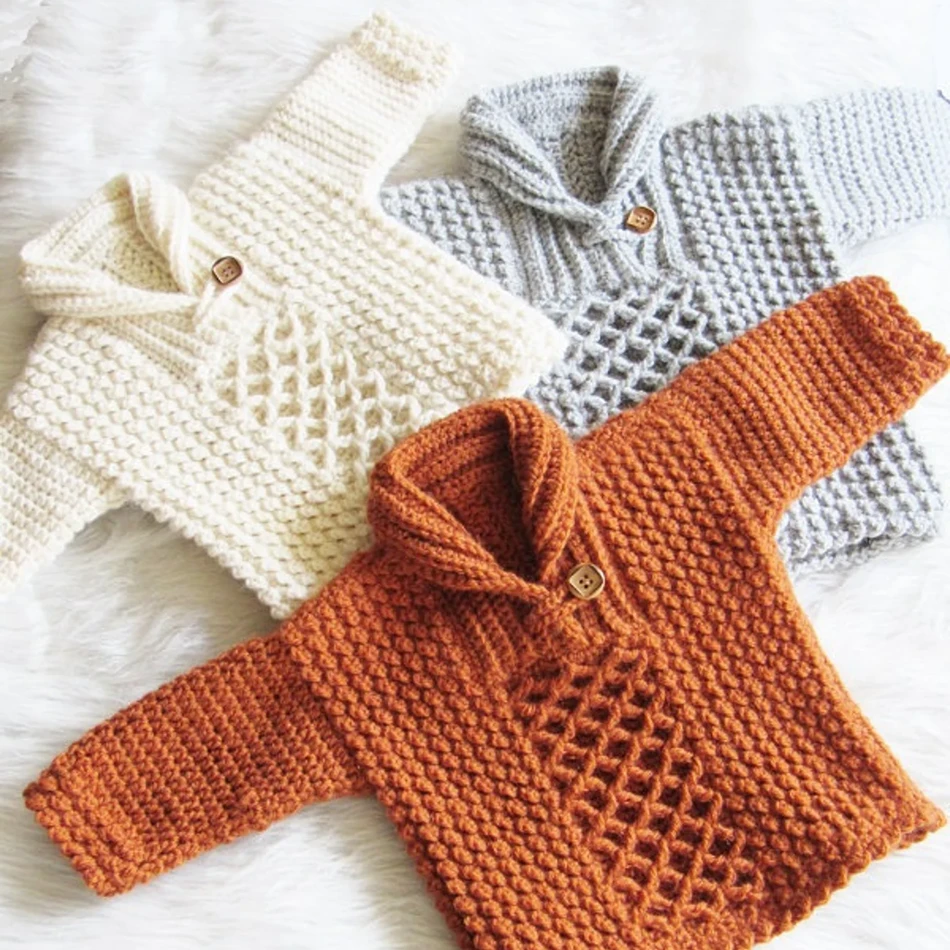 A crochet sweater pattern for babies and toddlers that features a beautiful mix of textures and a shawl collar.