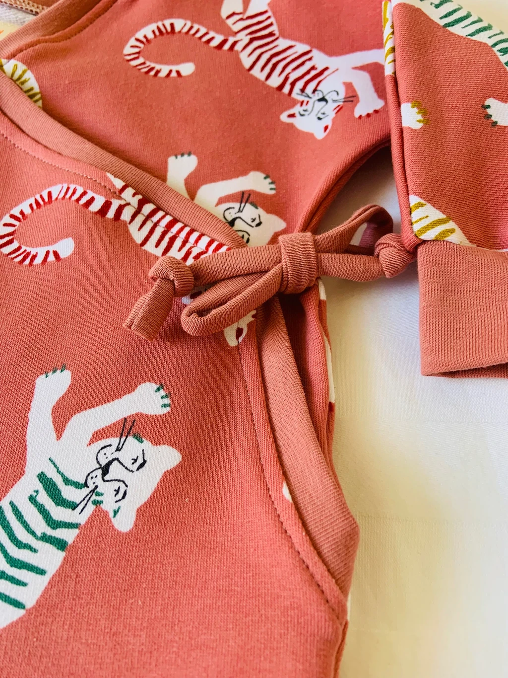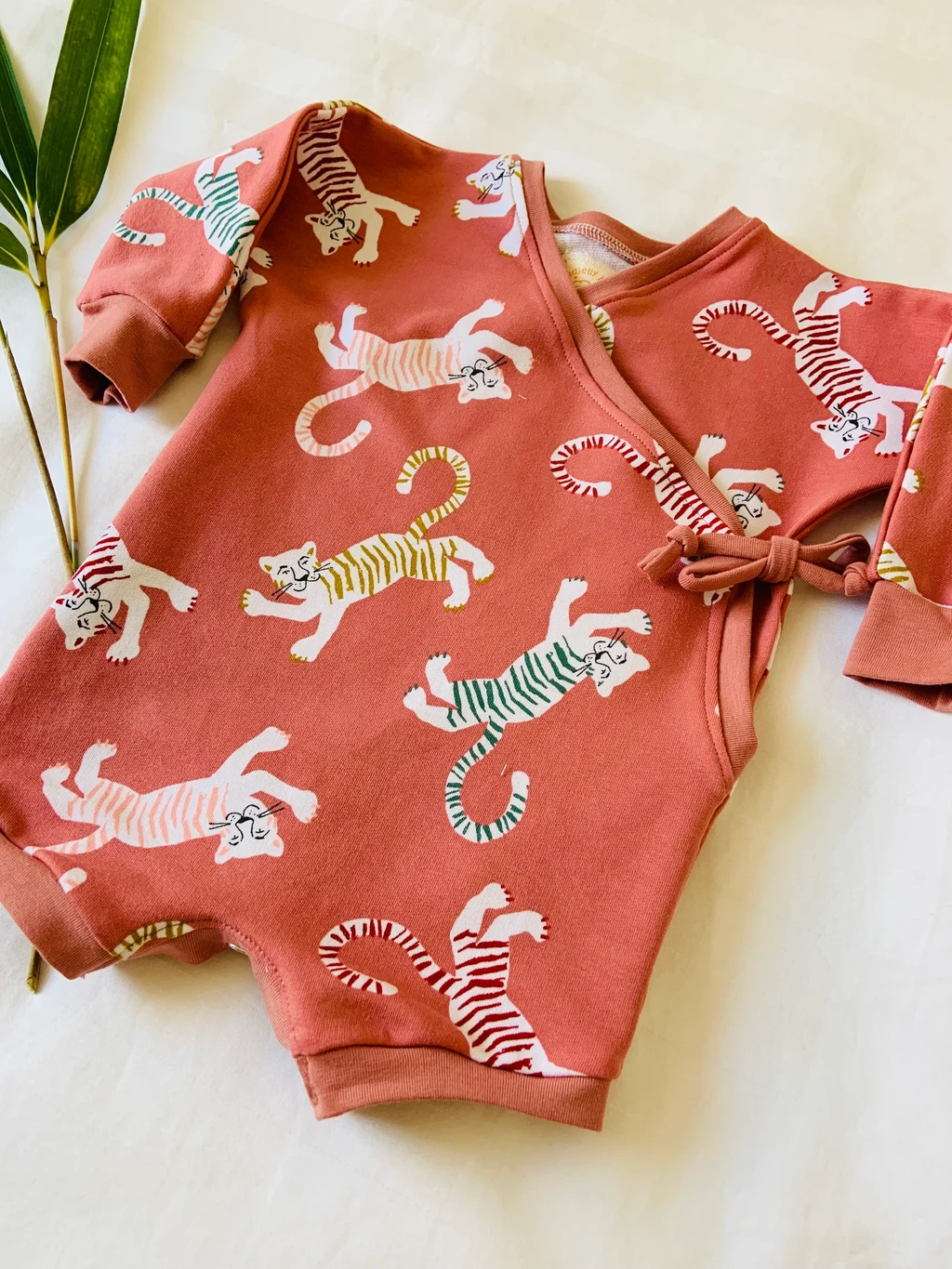 Cuddly wrapover bodysuit made with supersoft organic jersey with a cute tiger print.